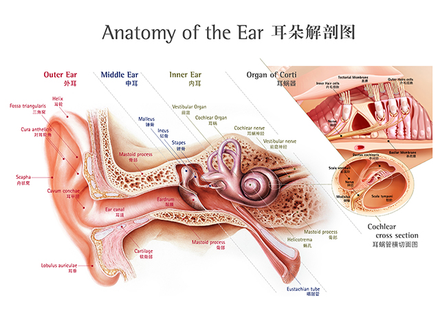 人的雙耳位于頭部兩側的顳區。它的主要功能依賴兩個重要器官完成:一個是接受外界傳入聲音的聽覺器官——耳蝸和與它連接的聽神經(又稱耳蝸神經);另一個是協助身體維持平衡的器官——前庭和半規管,與它們相連的是前庭神經。把感覺信息傳到大腦的聽神經中樞和前庭神經中樞。這一系列的裝置。所以,完成耳部功能的神經又簡稱為位(覺)聽(覺)神經系統。
